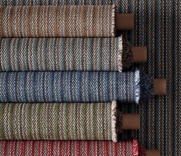 Treatable to BS5867 Part 2 Type B Curtain - A chevron weave with multi-coloured ombré vertical stripes.