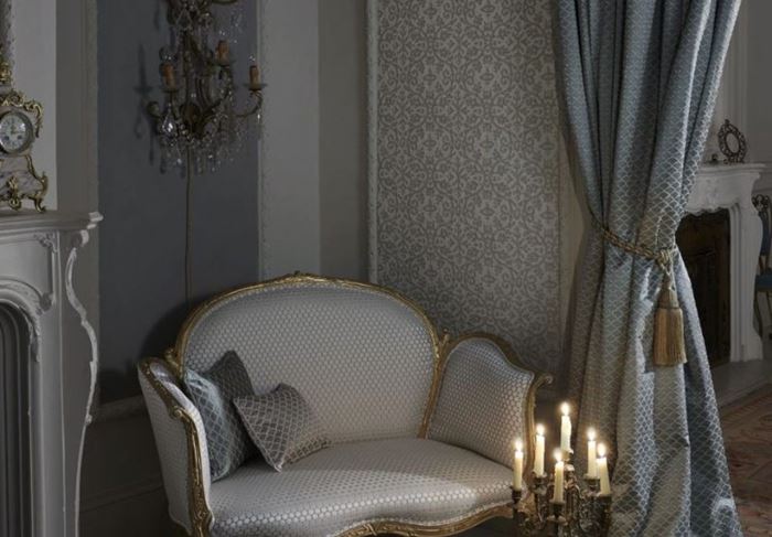 - A stately and imposing collection of decorative fabrics. Opulent jacquard weaves and embroideries portrayed in indulgent shades of ebony, antique gold and ivory.