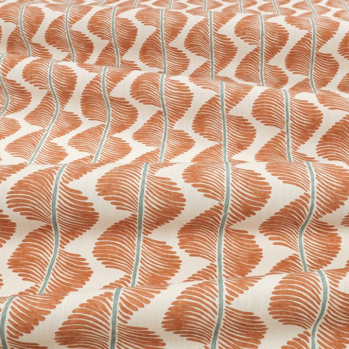 PFAS Free - A mesmerising wave of pattern with a vibrant flash of colour swirls down the cloth to form a striking stripe design. Printed on an organic and recycled cotton linen blend, details of the original hand-blocked artwork can be seen in the print. Subtle variations in shade and distinct markings create a truly unique design that celebrates the rich history of pattern making.