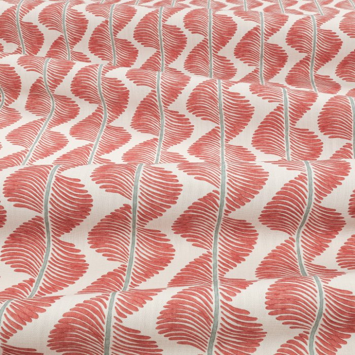 PFAS Free - A mesmerising wave of pattern with a vibrant flash of colour swirls down the cloth to form a striking stripe design. Printed on an organic and recycled cotton linen blend, details of the original hand-blocked artwork can be seen in the print. Subtle variations in shade and distinct markings create a truly unique design that celebrates the rich history of pattern making.