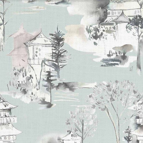 - An Idyllic oriental garden scene, painted with an expressive contemporary Toile de Jouy aesthetic. An oriental fabric inspired by traditional Asian architecture which is perfect for cushions and curtains.