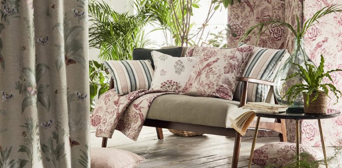 - Inspired by the English countryside and the charming wildlife that lives within these beautiful surroundings. Designs featuring floral trails, jacquard leaf silhouettes and delicately embellished butterflies pair with a sumptuous crushed velvet, dual purpose woven stripe and a rustic textural plain. Exquisitely detailed, 6 embroideries and weaves are available in 34 timeless colours. Emerald/Blush, Mineral/Denim sit alongside the fresh combination of Chartreuse/ Charcoal and Eau De Nil.