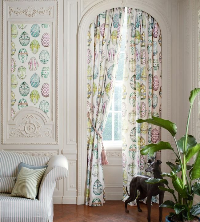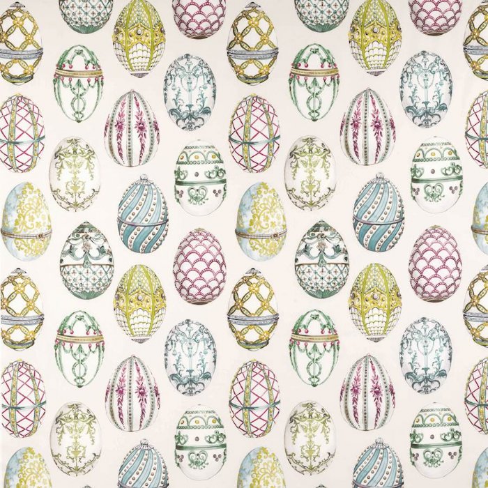 √BM: Passes Schedule 4 – Part 1 Resistance to smoldering cigarette when tested over a standard 22kgG/m³PU foam with a 2 ½ oz polyester wrap. For upholstery in the UK fabrics with this symbol must be used with a schedule 3 interliner, or be back coated to √BH level. - This jewel-like print on pure, cotton cretonne with a soft calendered finish depicts a collection of exquisite and meticulously hand painted eggs, inspired by the notorious creations of Fabergé. These opulent objects display captivating details and ornamentation, hand rendered in watercolour.
