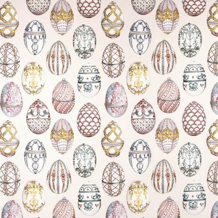 √BM: Passes Schedule 4 – Part 1 Resistance to smoldering cigarette when tested over a standard 22kgG/m³PU foam with a 2 ½ oz polyester wrap. For upholstery in the UK fabrics with this symbol must be used with a schedule 3 interliner, or be back coated to √BH level. - This jewel-like print on pure, cotton cretonne with a soft calendered finish depicts a collection of exquisite and meticulously hand painted eggs, inspired by the notorious creations of Fabergé. These opulent objects display captivating details and ornamentation, hand rendered in watercolour.