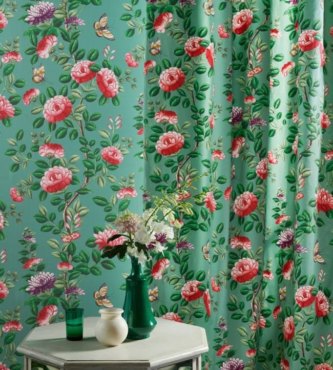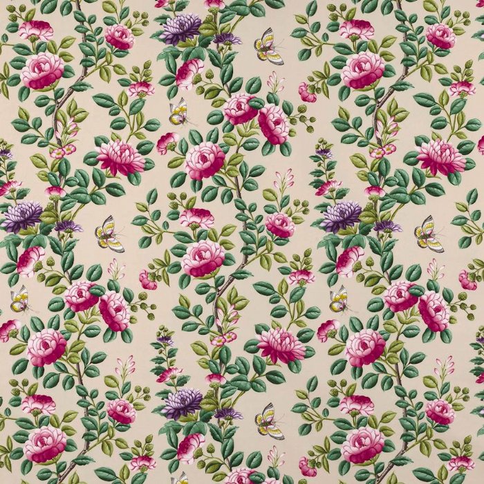 √BM: Passes Schedule 4 – Part 1 Resistance to smoldering cigarette when tested over a standard 22kgG/m³PU foam with a 2 ½ oz polyester wrap. For upholstery in the UK fabrics with this symbol must be used with a schedule 3 interliner, or be back coated to √BH level. - Flowers, foliage and discrete butterflies create this chinoiserie inspired print, adapted from a 19th Century Chinese folding screen. The original, graphic style of this historical design has been masterfully translated onto pure cotton fabric with a fluid drape.