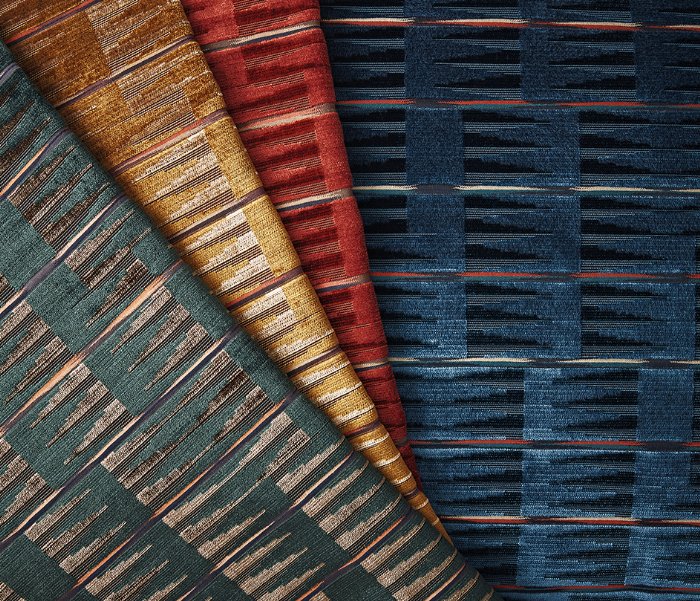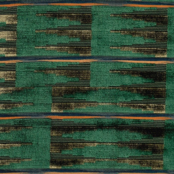 Treatable to BS5852 Crib 5 Upholstery - An ikat inspired, irregular geometric velvet is accented with a multi coloured horizontal stripe.