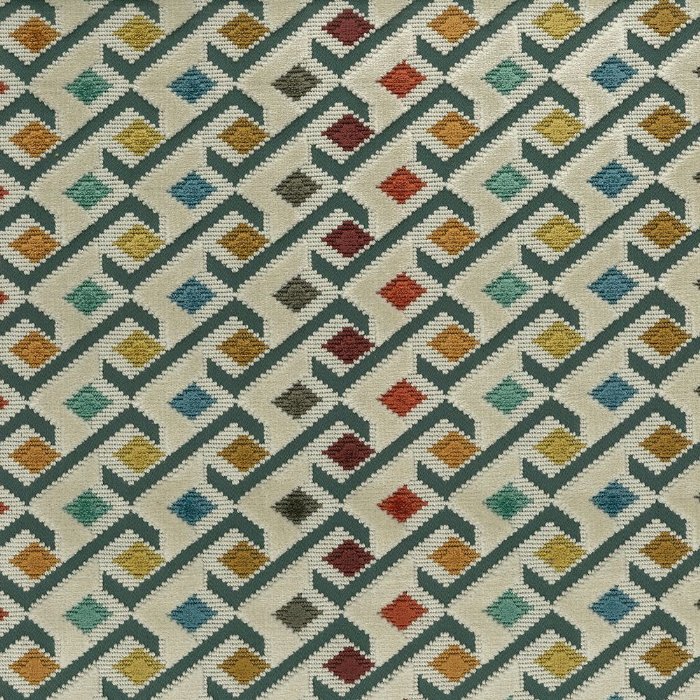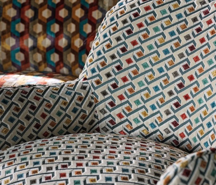 Treatable to BS5852 Crib 5 Upholstery - Multi-coloured diamonds in a diagonal design of cut and un-cut velvet.