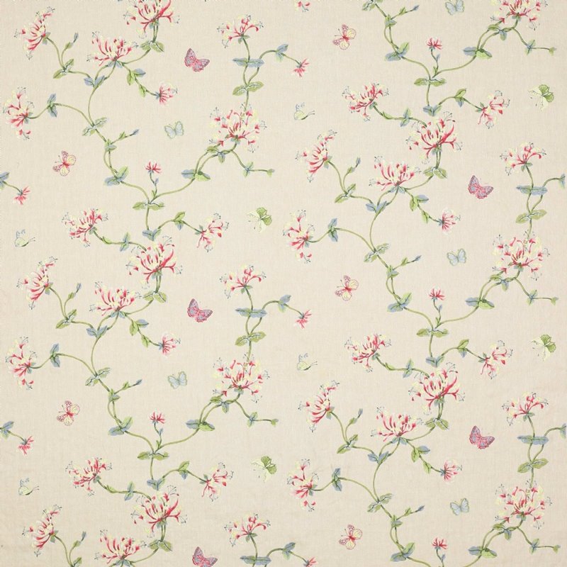 √BM - Passes Schedule 4 – Part 1 Resistance to smoldering cigarette when tested over a standard 22kgG/m³PU foam with a 2 ½ oz polyester wrap. For upholstery in the UK fabrics with this symbol must be used with a schedule 3 interliner, or be back coated to √BH level. - A beautiful country style embroidery incorporating this popular trailing garden flower combined with dancing butterflies. Honeysuckle Garden is available on a linen herringbone ground cloth as seen here. Alternatively it is available on a cream linen.