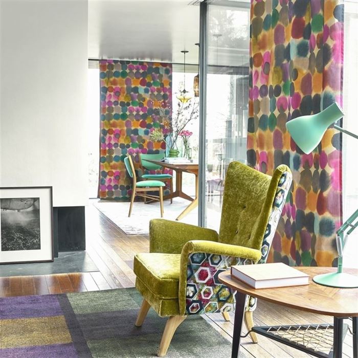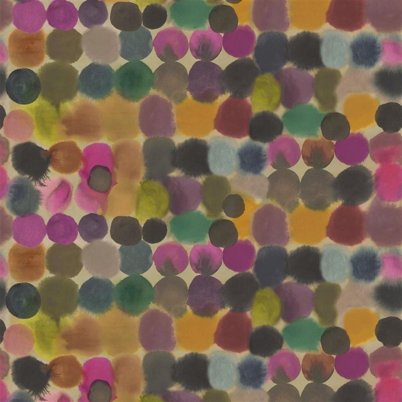 UK/EIRE Flamcode: (UK Flamcode B+M) Cigarette Resistant - In UK/Eire Upholstery use FR interliner or FR treat - An abstract circular formation in fluid watercolour creates a relaxed geometric pattern. Digitally printed onto a brushed cotton ground to further emphasise its abstract design. A statement fabric for artistic and tailored upholstery, curtains, cushions and blinds. In one vital colourway.
