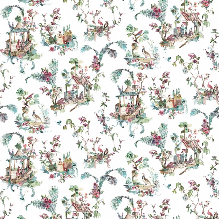 Treatable to BS5867 Part 2 Type B Curtain - A modern toile painted in watercolour featuring chinoiserie garden scenes with figures, birds and palms. Printed on linen union.
