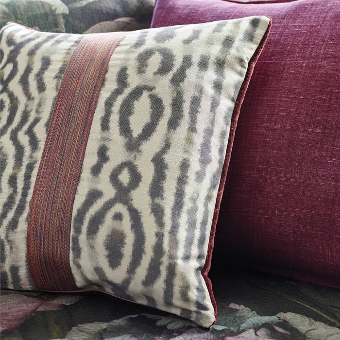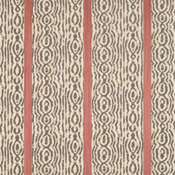 - A statement fabric of soft edged, global motifs in diverse colourways with a space dyed satin stripe framing the design. Inspired by the collection of ornate fabrics gathered from around the world and collected by the family of the Countess of Lennox, this fabric is suitable for blinds, curtains and cushions in an eclectic scheme.