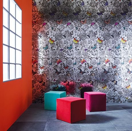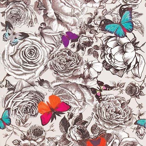 - An exotic composition of vibrantly coloured butterflies on finely detailed monochrome roses. Digitally printed with a repeat of 300cm (118ins).