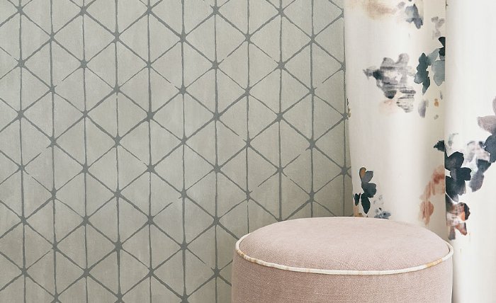 - A geometric design featuring hexagonal shapes with irregular lines that have a hand drawn feel, this all-over design mimics an embroidery with the use of tactile ink. The background of the wallcovering has a hand painted wash effect that adds captivating depth and movement.