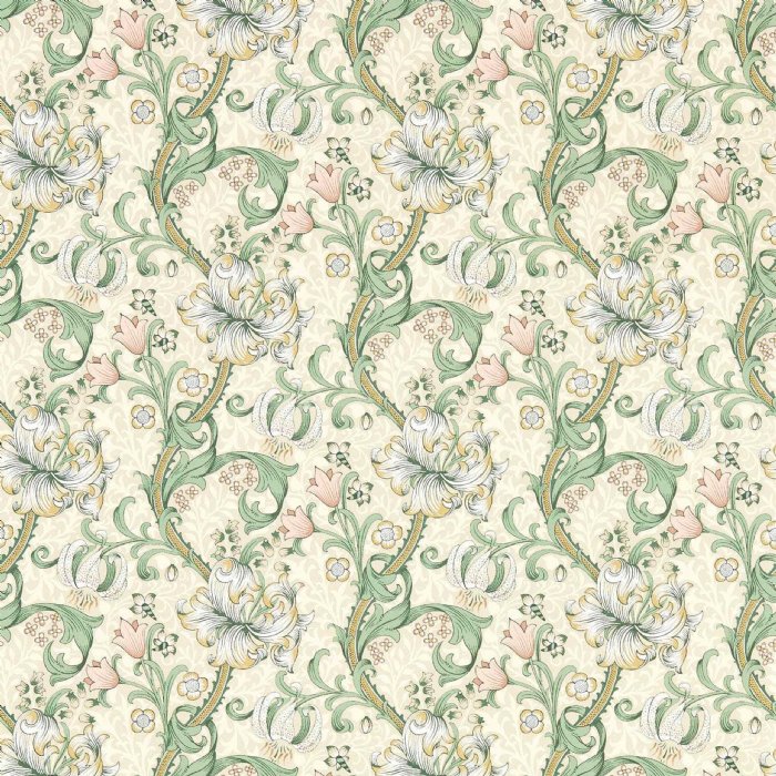Wallcovering - Vinyl - Offering a timeless appeal, Golden Lily features entwined lily stems amid a bed of other bright flower heads. Impactful and dramatic, this is a striking interpretation of William Morris`s timeless heritage design. With a reduced scale, Golden Lily is a versatile decorating solution for spaces of all sizes.