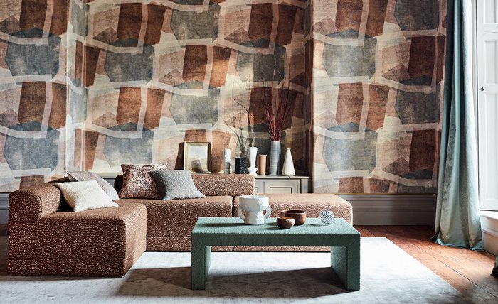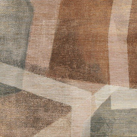 - A fusion of rustic and lustrous elements; an arresting, painterly geometric is bold in pattern, colour, and texture, printed on natural, woven raffia that has been delicately positioned on a glimmering foil background.